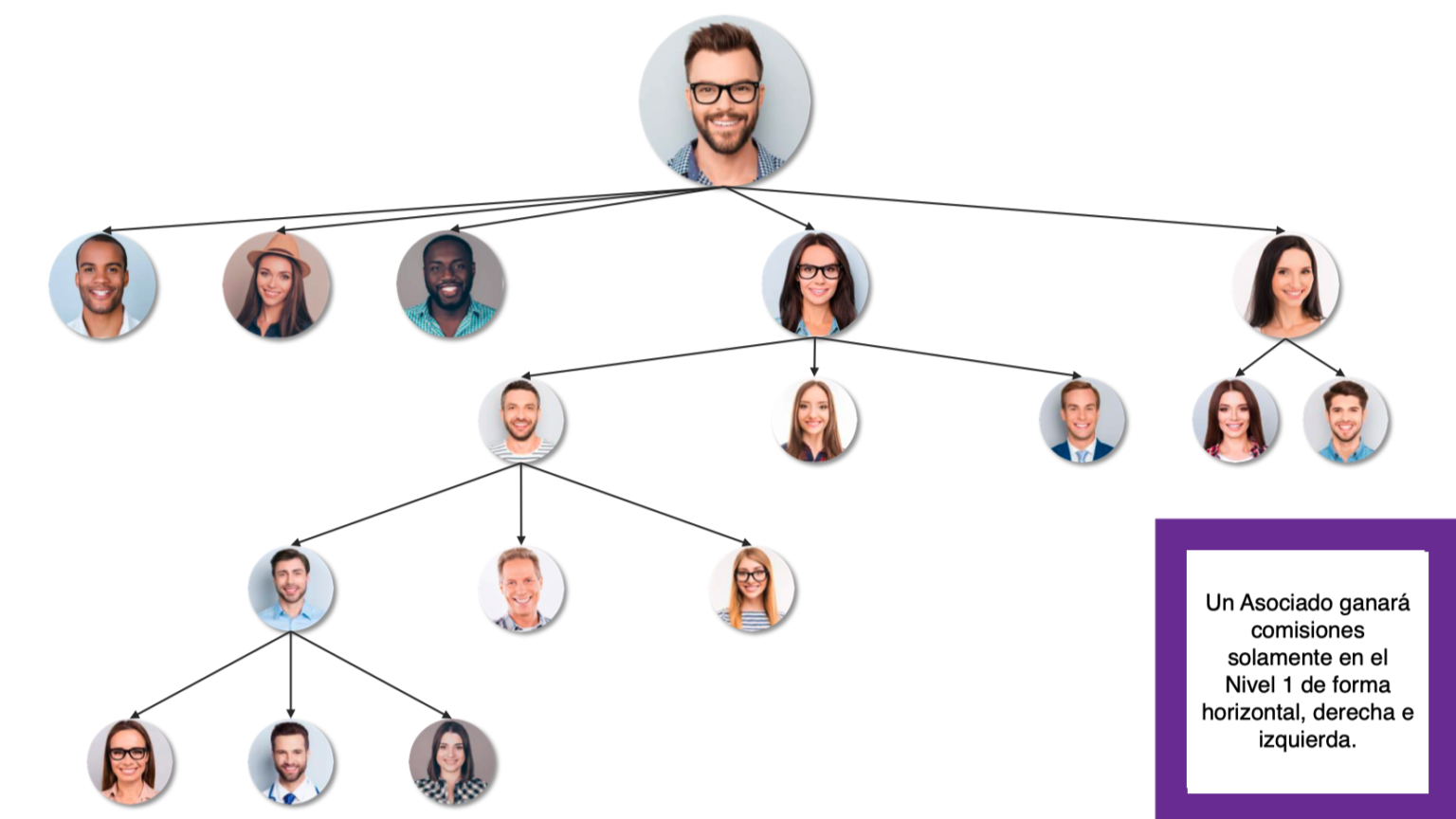 Un Asociado ganará comisiones solamente en el Nivel 1 de forma horizontal, derecha e izquierda.